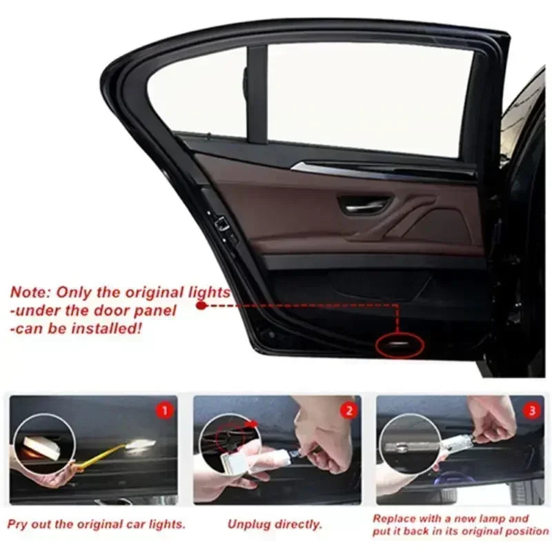 Diese Projektoren ersetzen die originale Türbeleuchtung die beim Öffnen auf den Boden strahlen mit dem von Dir ausgewählten Design.